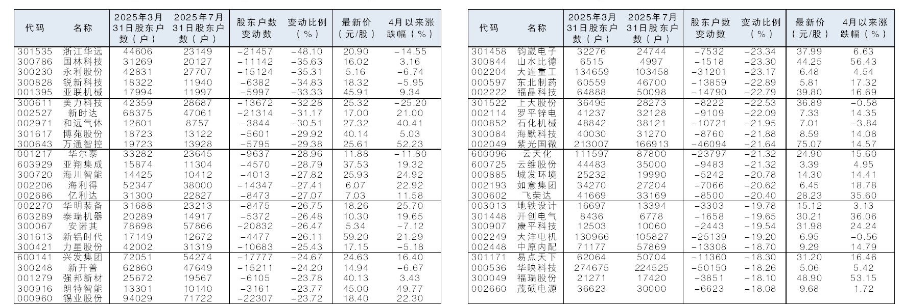 根据Wind数据统计,截至8月11日,已有787家公司披露截至7月31日的最新股东户数。其中,剔除ST股,49股股东户数相较于今年一季度末减少超过18%。从二级市场来看,山水比德、福瑞股份、万通智控等股股价4月以来涨幅居前。