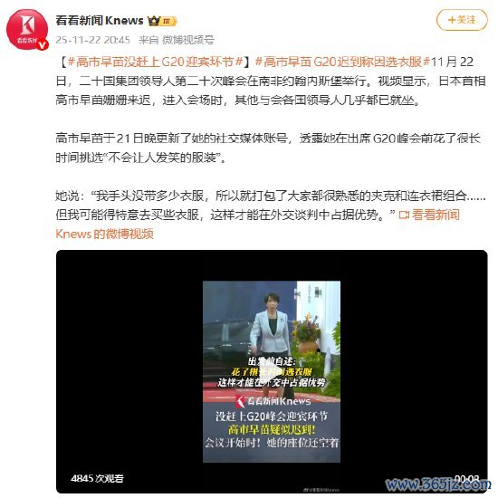 [#高市早苗没赶上G20迎宾环节#]#高市早苗G20迟到称因选衣服#11月22日,二十国集团领导人第二十次峰会在南非约翰内斯堡举行。视频显示,日本首相高市早苗姗姗来迟,进入会场时,其他与会各国领导人几乎都已就坐。